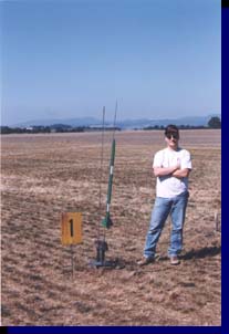 Here I am standing next to the Triad, my 3x38mm cluster rocket. This was the rocket's second flight, on 3 Aerotech I-357 Blue Thunder motors. |